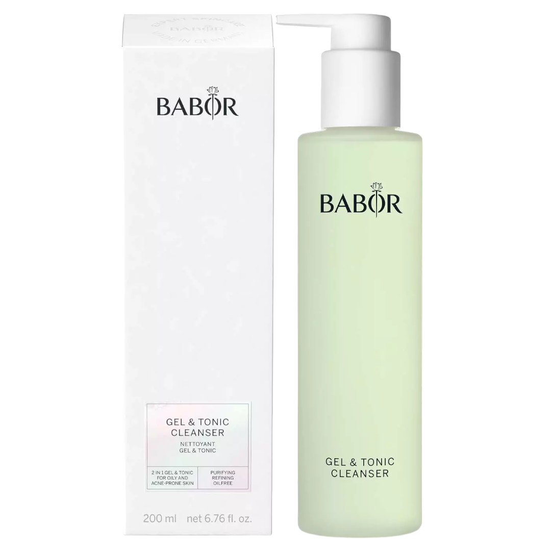 Babor Gel & Tonic Cleanser – yağlı, qarışıq və sızanağa meyilli dəri üçün nəzərdə tutulmuş 2-in-1 təmizləyici gel-tonikdir. Dərini dərin təmizləyir, artıq sebumu azaldır və məsamələri daraldaraq daha mat və təmiz görünüş bəxş edir.