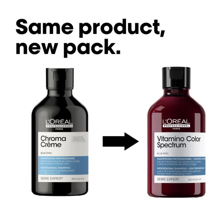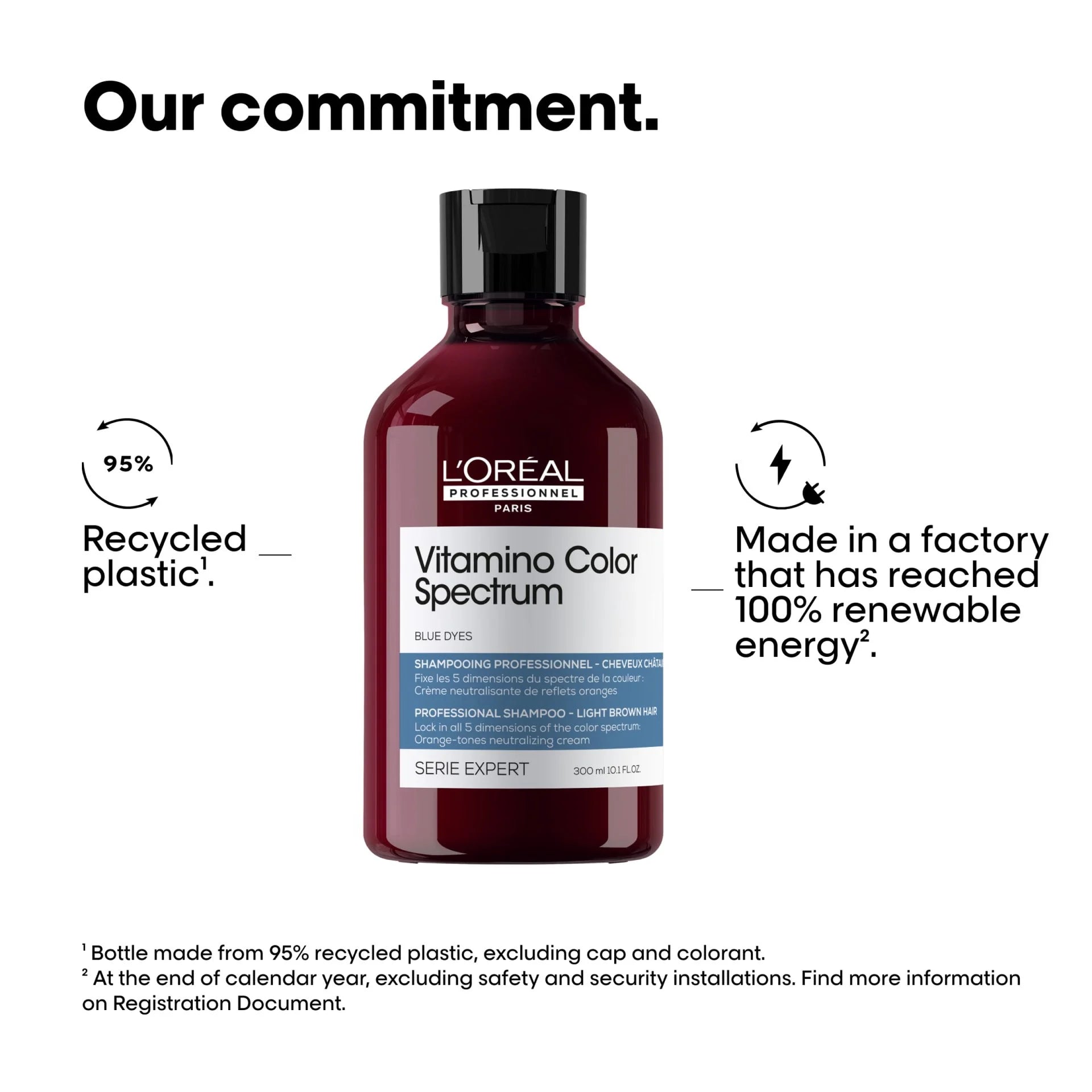 L'Oreal Professionnel Vitamino Color Spectrum Blue Dyes Shampoo Açıq qəhvəyi və boyalı saçlar üçün nəzərdə tutulmuş bu mavi piqmentli şampun saç rənginin daha təmiz, parlaq və baxımlı görünməsinə kömək edir. Formula istənməyən isti və narıncı alt tonların vizual olaraq neytrallaşdırılmasına dəstək olur.